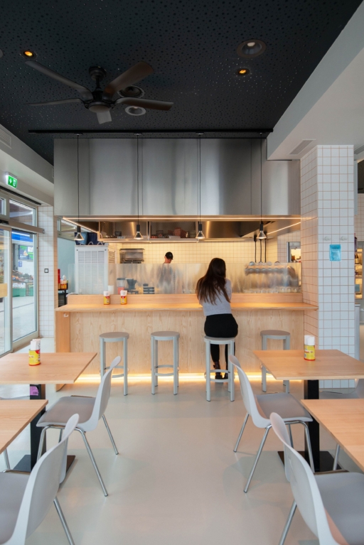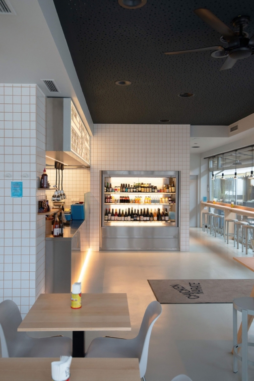 Das kompakte Lokal interpretiert das Prinzip des Marktstands zeitgemäß neu: Es verbindet Take-Away-Funktionalität mit der Möglichkeit, innerhalb des klar strukturierten Raumes zu verweilen. Mittelpunkt des Konzepts ist die offen gestaltete Küche, die als zentraler Raumkörper den gastronomischen Prozess sichtbar macht und über den integrierten Bestellschalter direkt mit dem Gast in Dialog tritt.